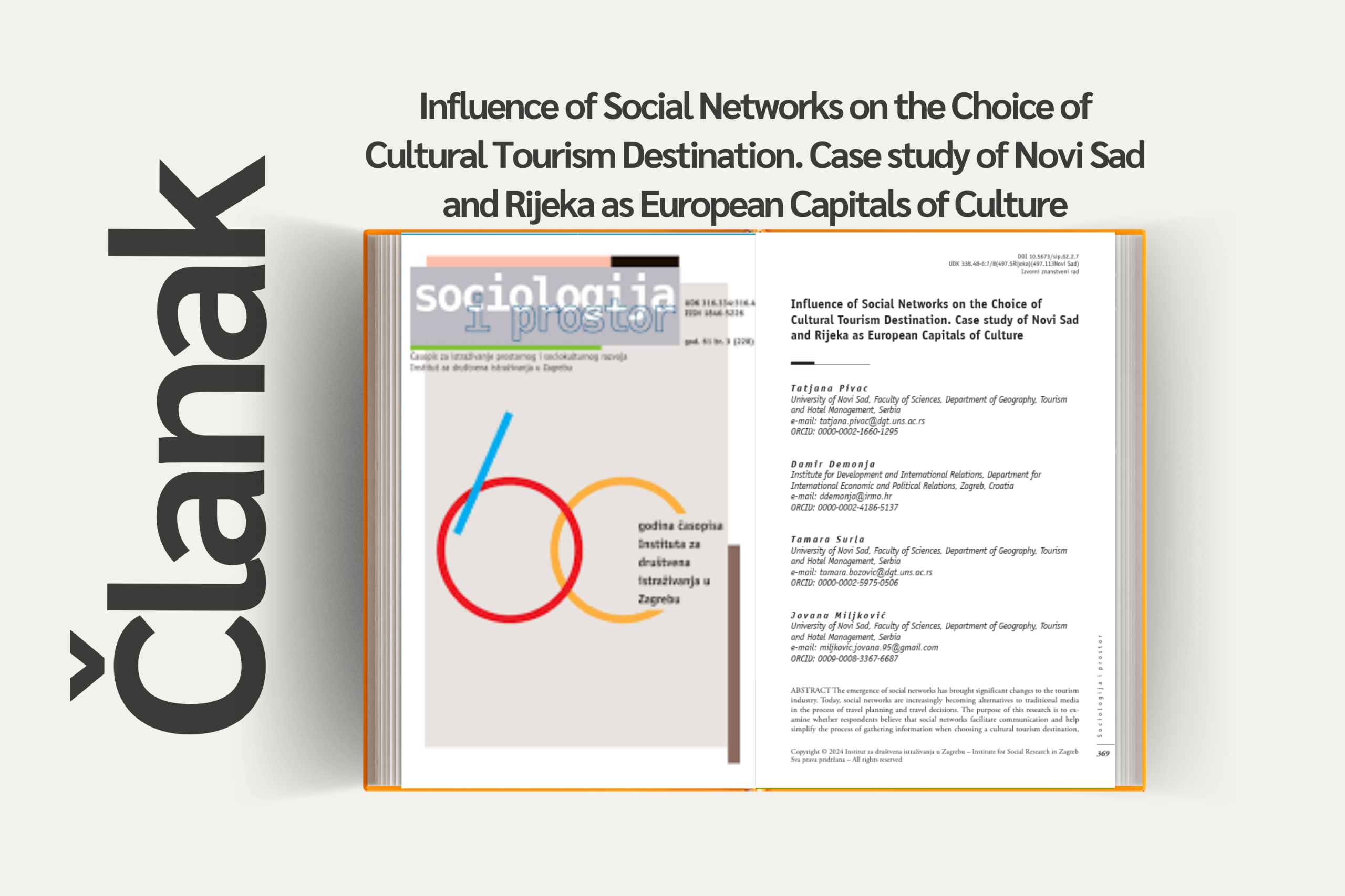 Dr. sc. Damir Demonja je objavio izvorni znanstveni članak “Influence of Social Networks on the Choice of Cultural Tourism Destination. Case study of Novi Sad and Rijeka as European Capitals of Culture” u znanstvenom časopisu „Sociologija i prostor: časopis za istraživanje prostornoga i sociokulturnog razvoja“, koji je indeksiran u bazama SCOPUS, SocINDEX (EBSCO), CSA SOCIOLOGICAL ABSTRACTS, CSA WORLDWIDE POLITICAL SCIENCE ABSTRACTS i CSA SOCIAL SERVICES ABSTRACT (SELECTIVE). Članak je pisan u suradnji s prof. dr. sc. Tatjanom Pivac, redovitom profesoricom s Univerziteta u Novom Sadu, Prirodno-matematičkog fakulteta, Departmana za geografiju, turizam i hotelijerstvo, dr. sc. Tamarom Surla, asistenticom s Univerziteta u Novom Sadu, Prirodno-matematičkog fakulteta, Departmana za geografiju, turizam i hotelijerstvo i mr. sc. Jovanom Miljković, doktoranticom s Univerziteta u Novom Sadu, Prirodno-matematičkog fakulteta, Departmana za geografiju, turizam i hotelijerstvo,